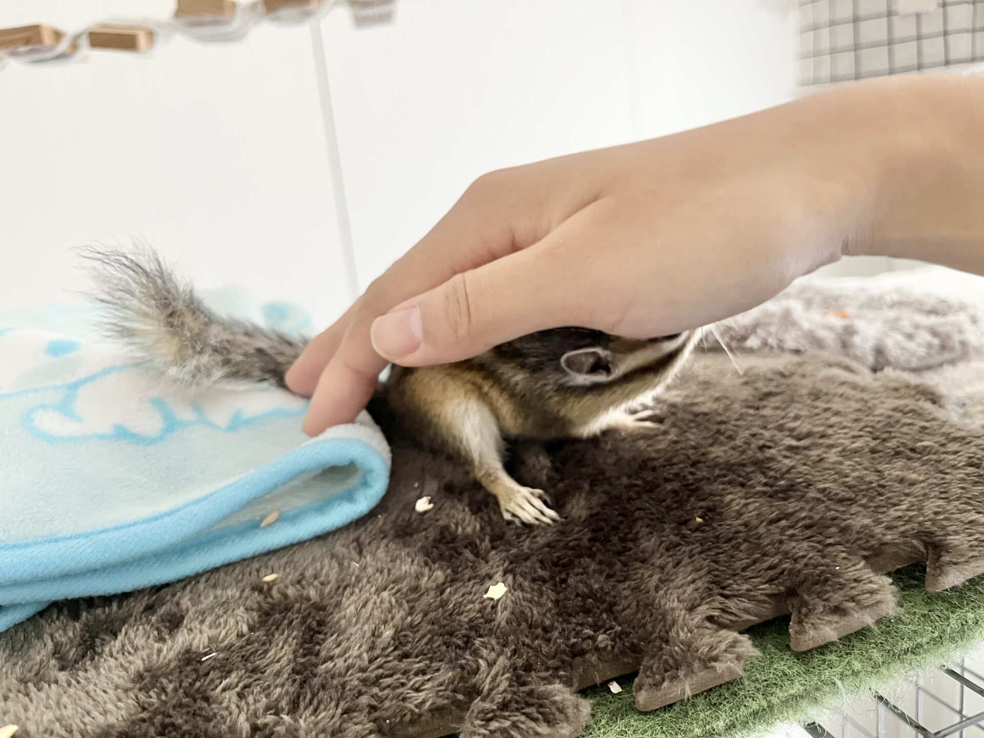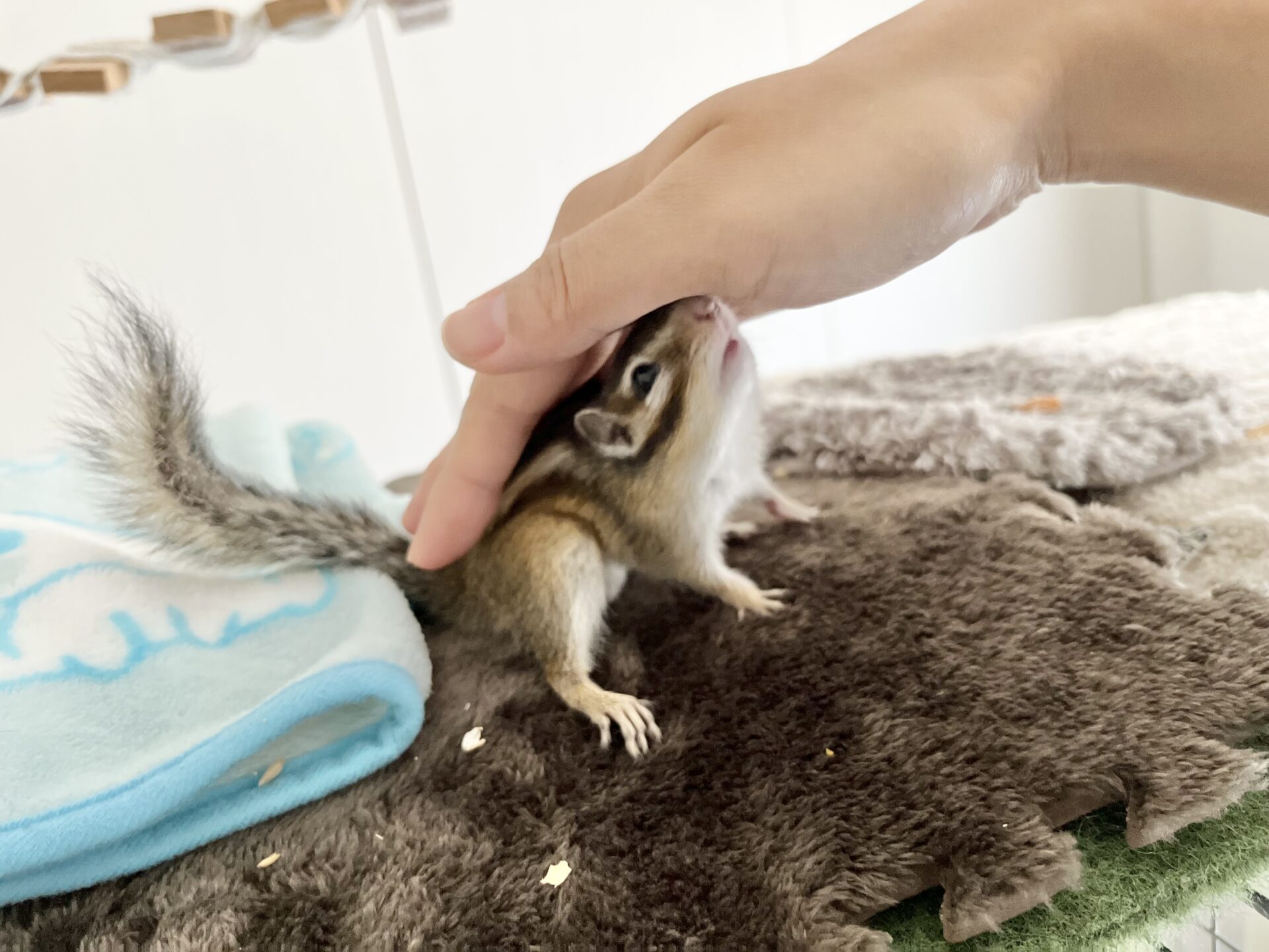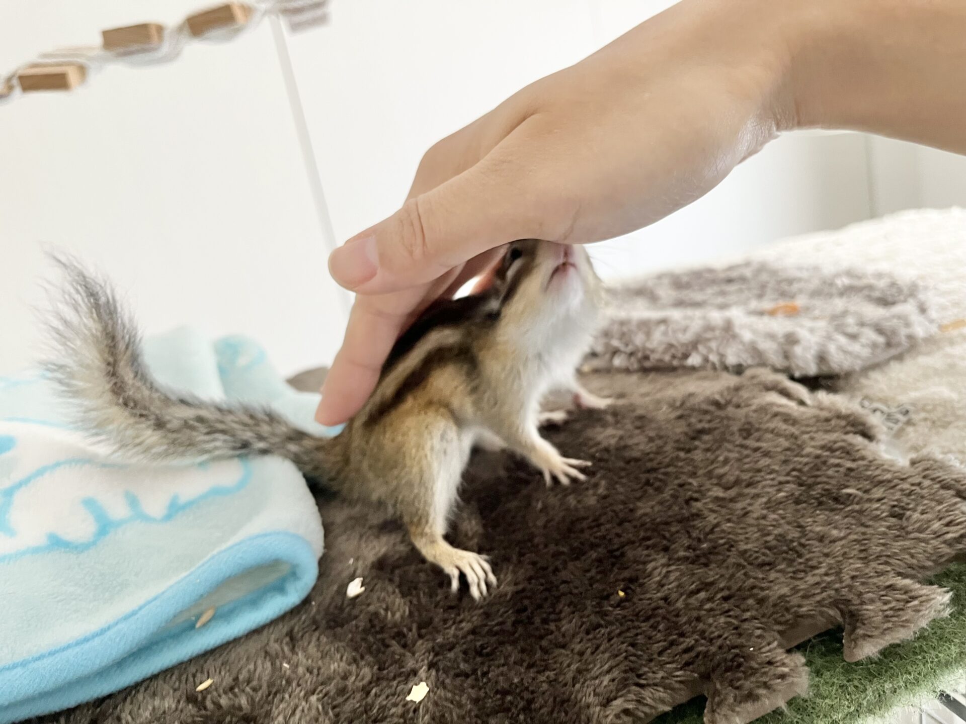もし、まだりす見知りしてる子の場合は、正面からそーっと近づいて「触るよ」と心構えをさせてあげるのがいいと思います。