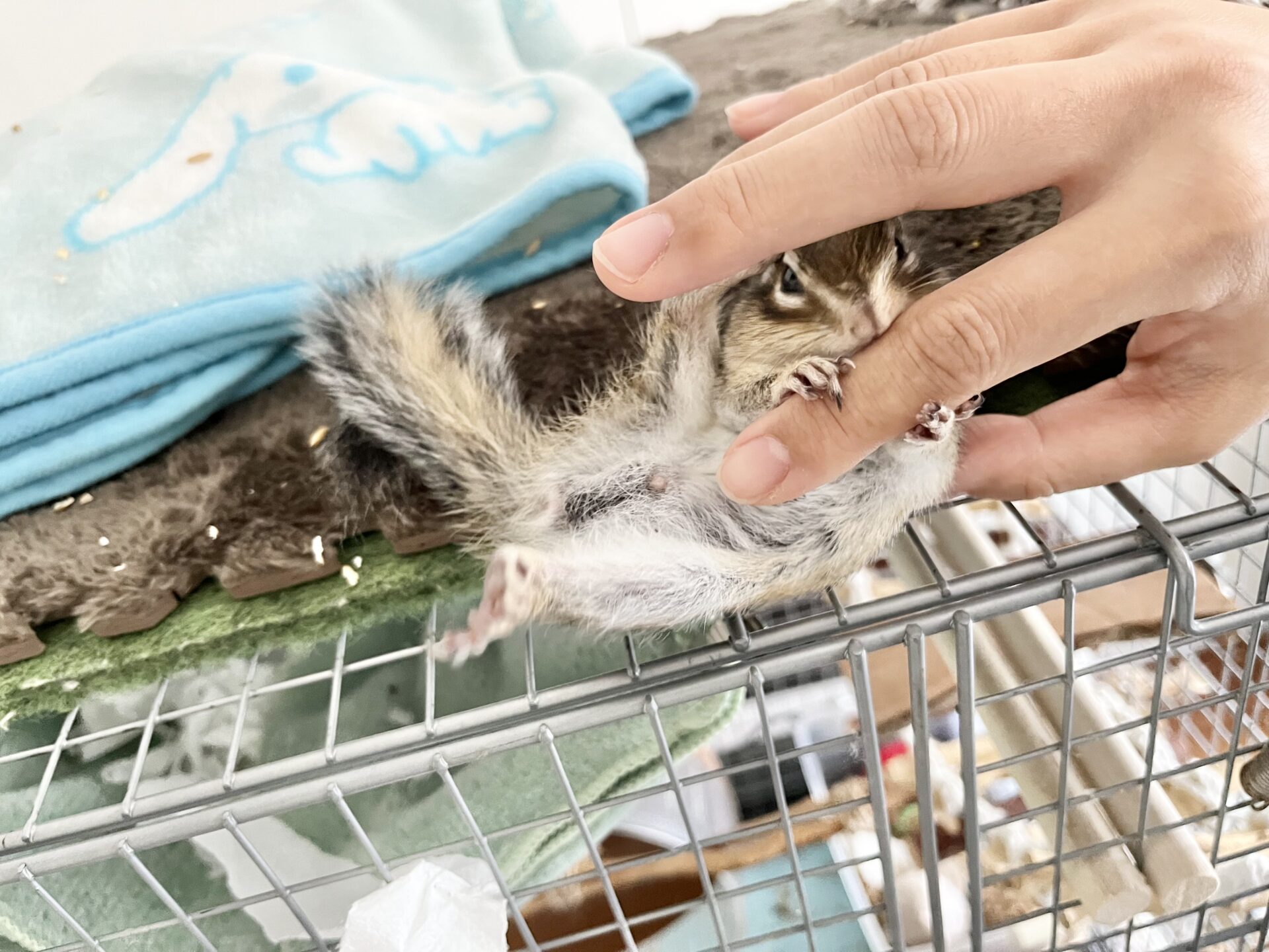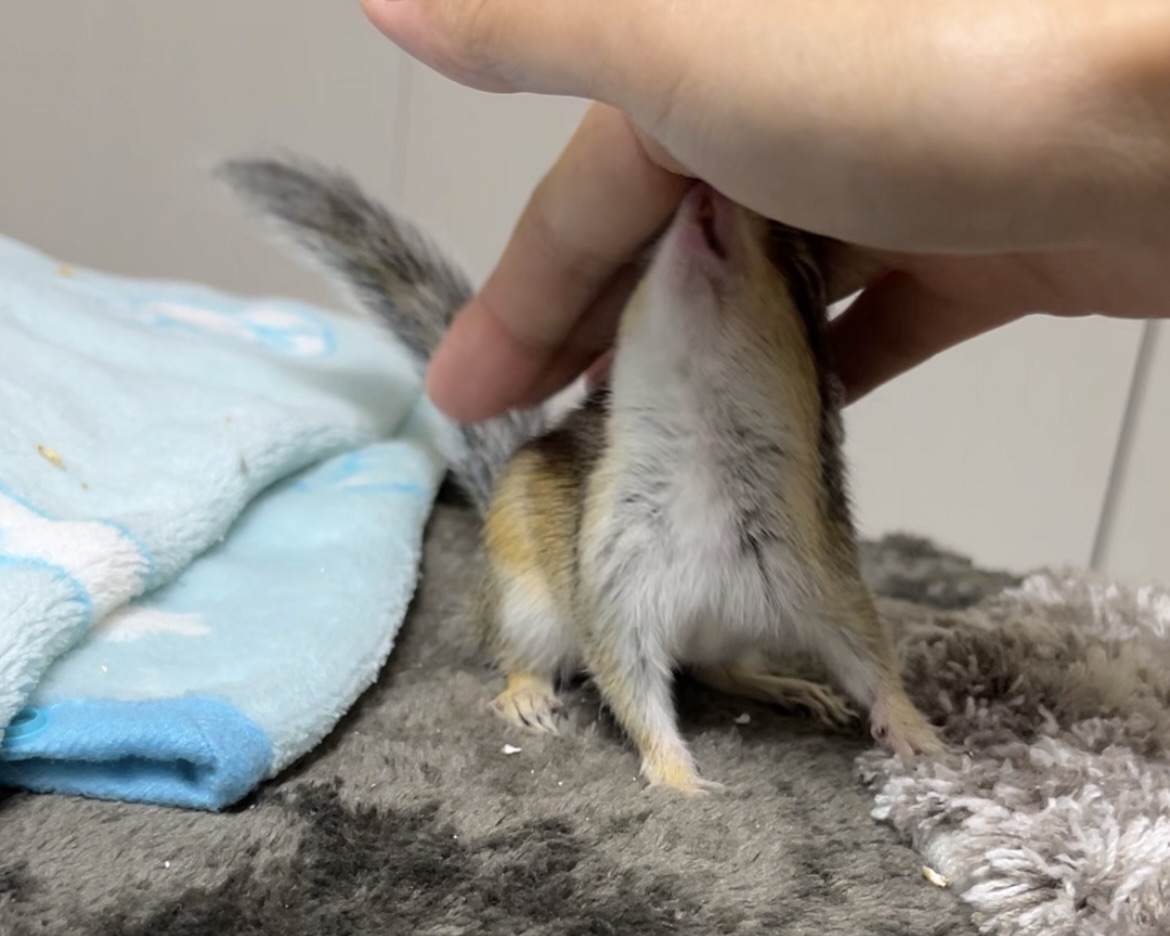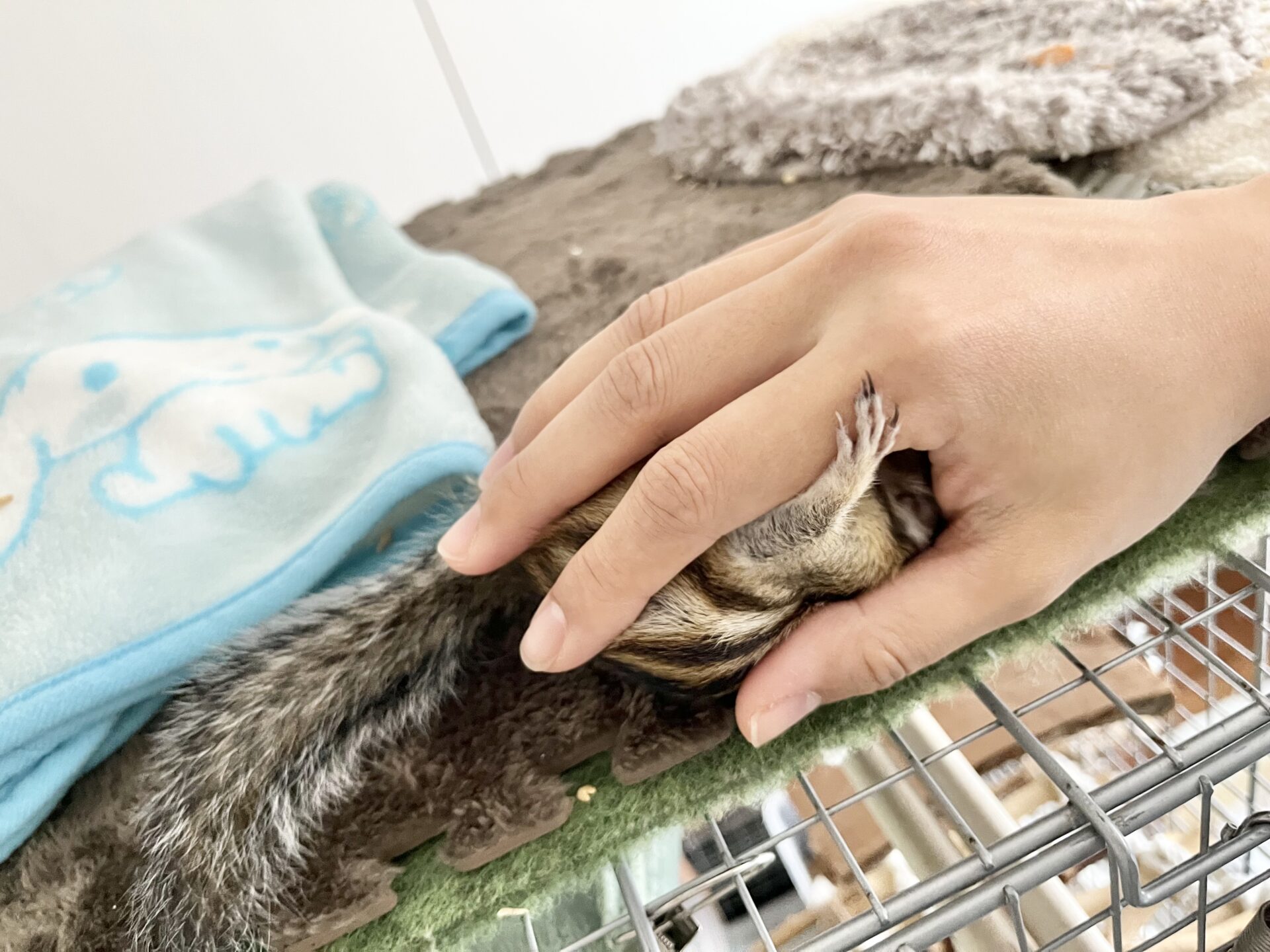 もし、まだりす見知りしてる子の場合は、正面からそーっと近づいて「触るよ」と心構えをさせてあげるのがいいと思います。