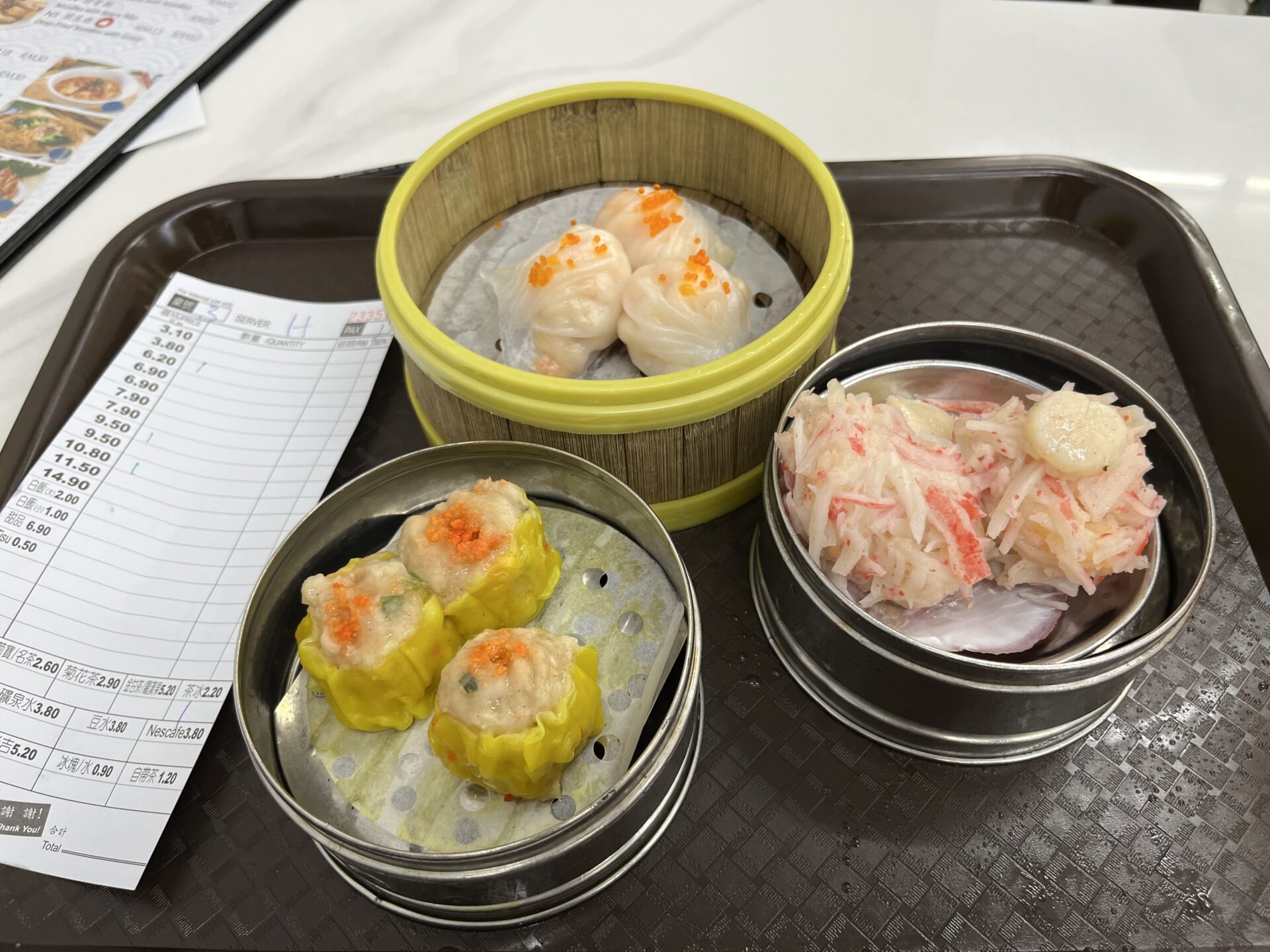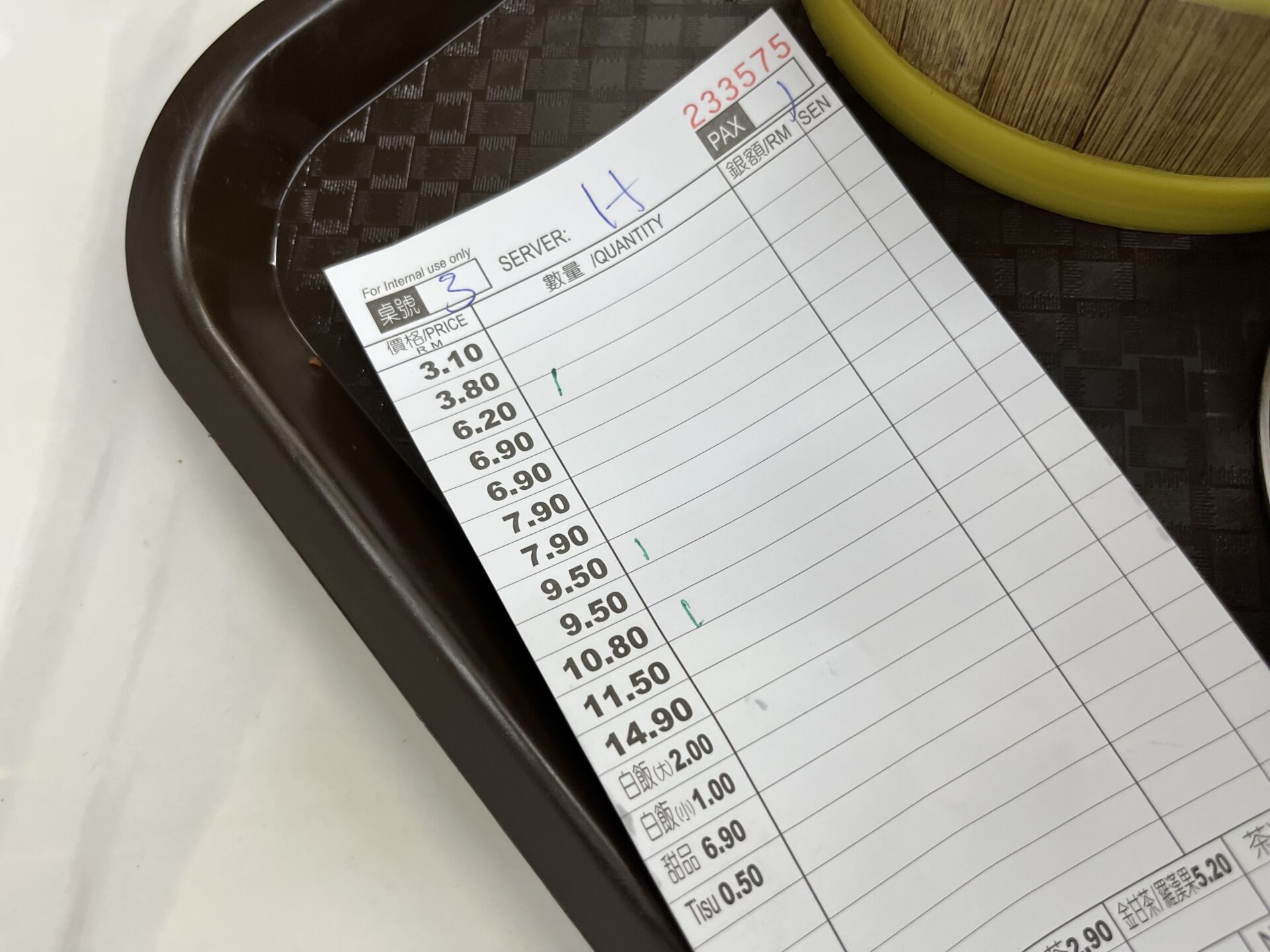 会計は、3つの点心がRM26.5、ジャスミンティーが2.6RM。
