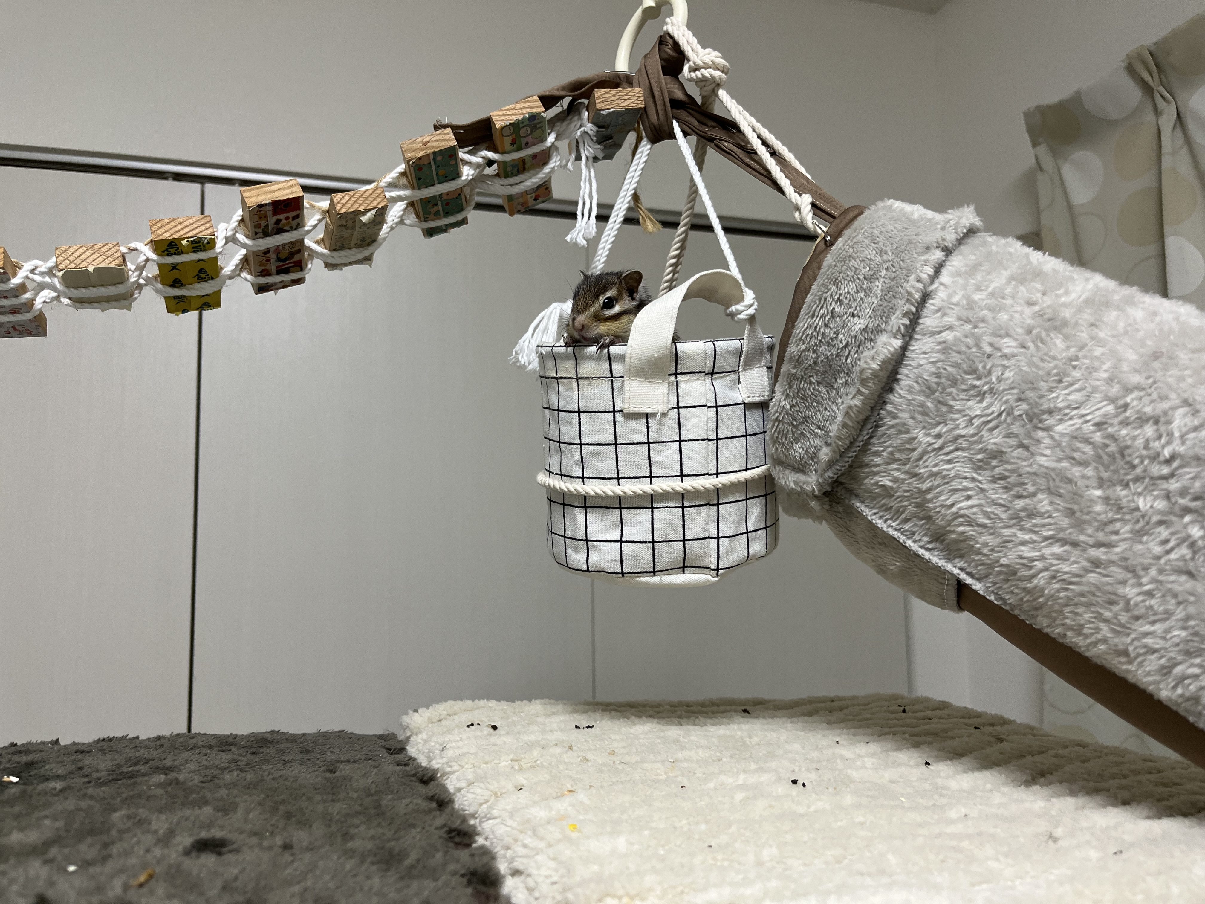 トンネルとはしごは手作り🙌カゴとネットは、元々部屋についてた物干し用の棒から吊るしてます♪